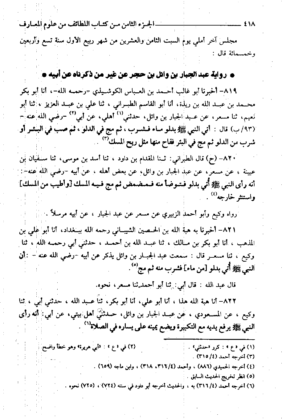 804- قرأت على الإمام أبي نصر أحمد بن عمر الحافظ -رحمه الله- قال: قرأت على عبد الله بن محمد الأنصاري، أنا إسحاق بن إبراهيم، أنا أحمد بن عبد الواحد الشيرازي، ثنا عبد الله بن محمد بن عبد الوهاب المقري بأصبهان، (ح) وأخبرنا أبو علي الحداد، ثنا أبو نعيم الحافظ، ثنا أبي قالا: ثنا أبو الحسن أحمد بن محمد بن عمر قال: سمعت عبد الله بن أحمد بن حنبل، حدثني أبو حفص عمر بن صالح الطرسوسي يقول: ذهبت أنا ويحيى الجلاء -وكان يقال: إنه من الأبدال- إلى أحمد بن حنبل -رحمه الله- وإلى جنبه فوزان وزهير وهارون الحمال، فقلت: رحمك الله أبا عبد الله بما يلين القلب، فنظر إلى أصحابه فغمزهم بعينه ثم أطرق ساعة، ثم رفع رأسه فقال: يا بني يأكل الحلال.