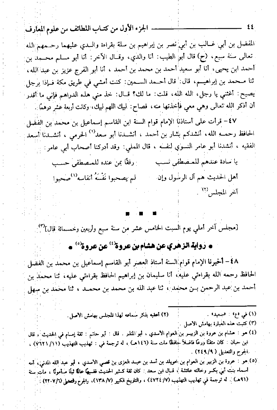 42- أخبرنا الحسن بن أحمد المقرئ، وجعفر بن أبي منصور الكاتب قالا: أنا محمد بن أحمد الكاتب، ثنا عبد الله بن محمد بن جعفر، حدثني وليد بن بنان الواسطي، ثنا محمد بن زنبور، ثنا عبد العزيز بن أبي حازم، حدثني سهيل، عن الأعمش، عن أبي صالح، عن أبي هريرة –رضي الله عنه-: أن رسول الله صلى الله عليه وسلم نزل في غزوة غزاها فأصاب أصحابه جوع وفنيت أزوادهم، فجاءوا إلى رسول الله صلى الله عليه وسلم يشكون [إليه] ما أصابهم ويستأذنونه أن ينحروا بعض رواحلهم، فأذن لهم، فمروا بعمر بن الخطاب رضي الله عنه فقال: من أين جئتم؟ فأخبروه أنهم استأذنوا النبي صلى الله عليه وسلم أن ينحروا بعض رواحلهم، قال: فأذن لكم؟ قالوا: نعم، قال [فإني أسألكم] وأقسم عليكم إلا رجعتم معي إلى رسول الله صلى الله عليه وسلم [فرجعوا معه] فذهب عمر إلى رسول الله صلى الله عليه وسلم فقال: يا رسول الله أتأذن لهم أن ينحروا رواحلهم، فماذا يركبون؟ فقال رسول الله صلى الله عليه وسلم: ((فماذا أصنع؟ ليس معي ما أعطيهم)) قال عمر رضي الله عنه: بل يا رسول الله [تأمر] من كان معه فضل [من] زاد يأتي به إليك فتجمعه [على شيء] ثم تدعو فيه بالبركة ثم تقسمه بينهم، ففعل، فدعا بفضل أزوادهم، فمنهم الآتي بالقليل، ومنهم الآتي بالكثير فجعله في شيء ثم دعا فيه ما شاء [الله] تعالى أن يدعو ثم قسمه بينهم، فما بقي من القوم أحد إلا ملأ ما كان معه من وعاء، وفضل فضل فقال عند ذلك: ((أشهد أن لا إله إلا الله وحده لا شريك له، وأن محمداً عبده ورسوله من جاء بهن يوم القيامة غير شاك أدخله الله تعالى الجنة)) .