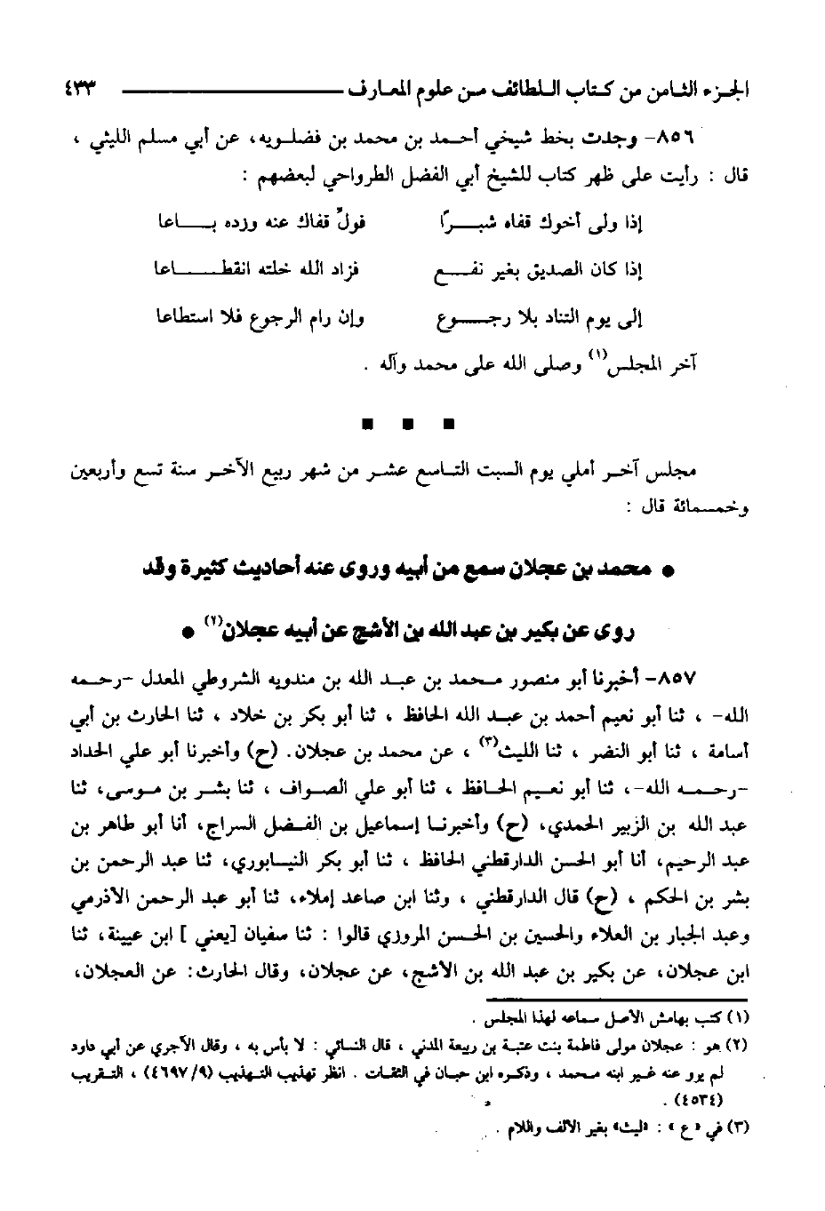 834- أخبرنا الحافظ أبو البركات عبد الوهاب بن المبارك الأنماطي -رحمه الله- قرأته عليه ببغداد، أخبرنا محمد بن فتوح الأندلسي، أنا أبو أحمد عبد الله بن محمد الدهان، ثنا أبو جعفر أحمد بن حسن البردعي، أنشدنا أبو هريرة أحمد بن الحسن العدوي، أنشدنا أبو الطاهر الوكيل لنفسه: