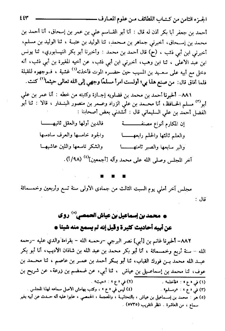 855- أخبرنا أحمد بن علي الأسواري -رحمه الله- إذناً، أنا أحمد بن جعفر الفقيه [إذناً] ، أنا علي بن عمر الأسداباذي، أنا أبو بكر بن إسحاق، أنا أبو بكر النيسابوري، أنا أبو الأزهر أحمد بن الأزهر، ثنا يعقوب بن إبراهيم بن سعد، ثنا عاصم بن محمد، عن أخيه عمر بن محمد، عن أبيه محمد بن زيد، عن ابن عمر -رضي الله عنهما- قال: قال رسول الله صلى الله عليه وسلم: ((إذا صار أهل الجنة إلى الجنة وأهل النار إلى النار جيء بالموت حتى يجعل بين الجنة والنار ثم يذبح، ثم ينادي مناد: يا أهل الجنة، لا موت ويا أهل النار، لا موت، فيزداد أهل الجنة فرحاً إلى فرحهم، ويزداد أهل النار حزناً إلى حزنهم)) .
