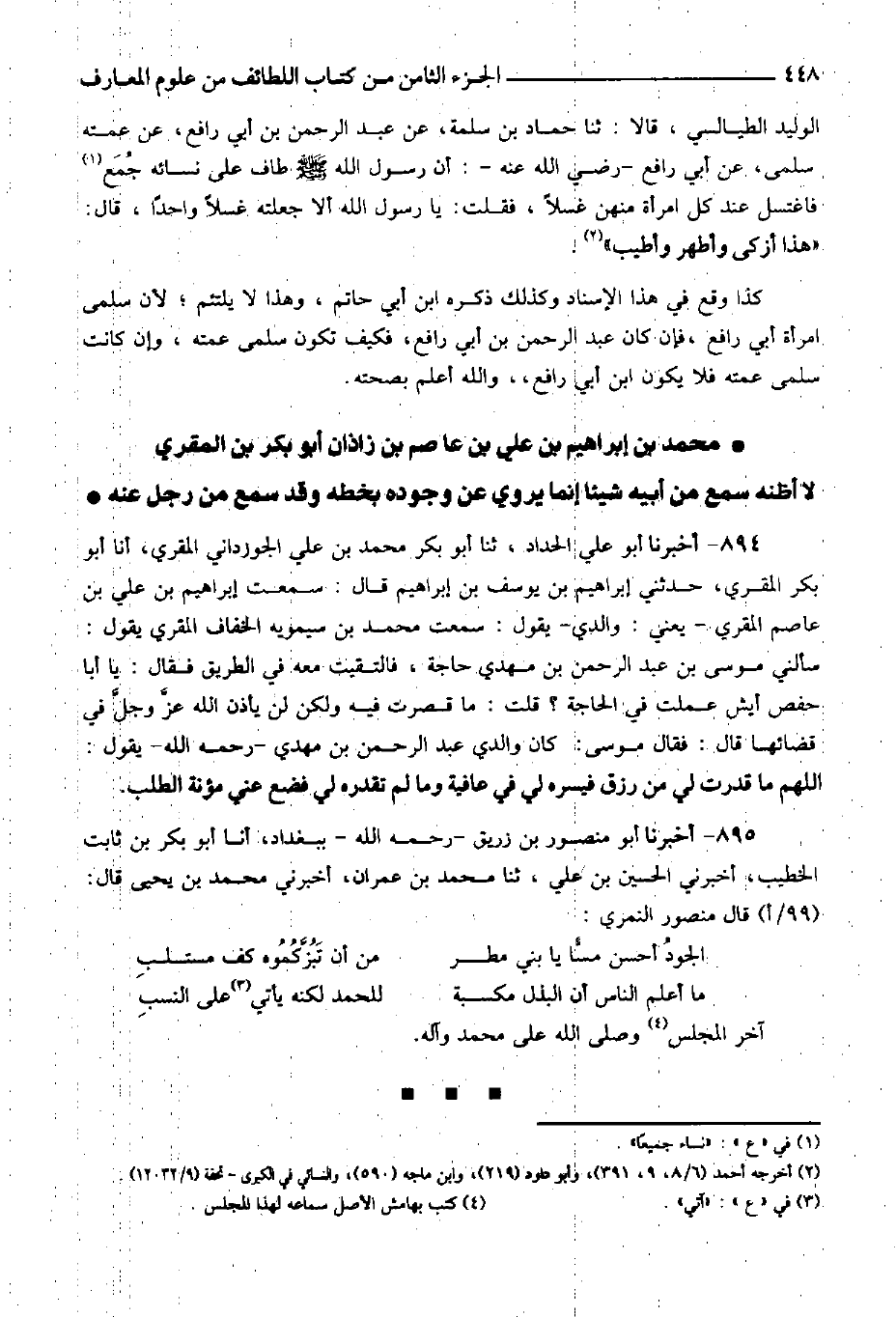 867- أخبرنا إسماعيل بن الفضل بن الإخشيد، أنا أبو طاهر بن عبد الرحيم، أنا الدارقطني، قال: ثنا عمر بن الحسن القراطيسي، ثنا الحسن بن القاسم البجلي، ثنا -[438]- محمد بن عبد الله بن صالح، ثنا إبراهيم بن يوسف، عن أبيه، عن أبي إسحاق، عن محمد بن عبد الرحمن الأنصاري، عن المنهال بن عمرو، عن عبد الرحمن بن أبي ليلى قال: كان علي -رضي الله عنه- يخرج إلينا في القباء المحشو في الصيف وفي الإزار في الشتاء، فأنكر الناس ذلك، فقالوا لأبي ليلى رضي الله عنه، فسأله [فقال] : أما كنت معنا بخير قال: بلى، قال: فإني والله ما وجدت حراً ولا قراً منذ دعا لي رسول الله صلى الله عليه وسلم.