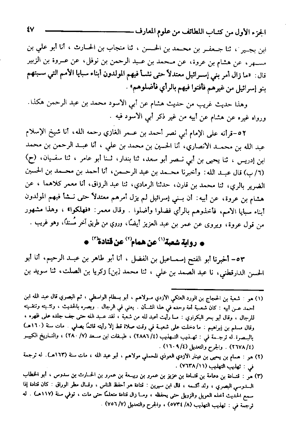 49- أخبرنا الفقيه أبو [سعد] محمد بن محمد بن محمد المطرز إذناً رحمه الله، أن أحمد بن عبد الله أخبرهم، ثنا أبي، ثنا عبد الرحيم بن محمد بن عمر النهاوندي، ثنا عمرو بن علي، ثنا يحيى بن سعيد، قال سمعت هشام بن عروة يقول: سمعت الزهري يحدث عن عروة، عن عائشة رضي الله عنها قالت: ((ما خير رسول الله صلى الله عليه وسلم بين أمرين إلا اختار أيسرهما ما لم يكن فيه مأثم)) .