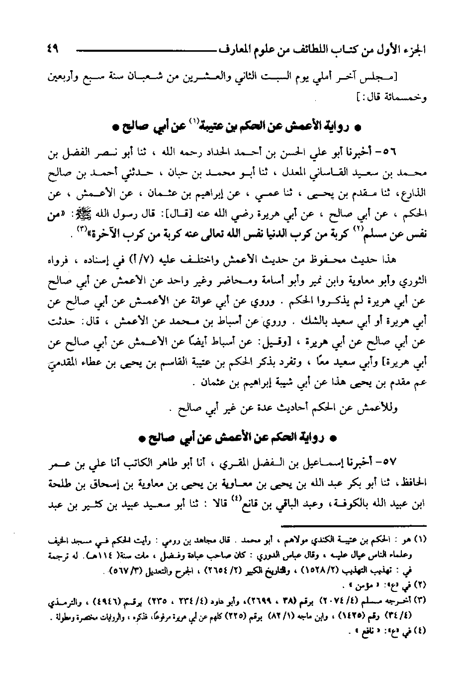 52- قرأته على الإمام أبي نصر أحمد بن عمر الغازي رحمه الله، أنا شيخ الإسلام عبد الله بن محمد الأنصاري، أنا الحسين بن محمد بن علي، أنا عبد الرحمن بن محمد بن إدريس، ثنا يحيى بن أبي نصر أبو سعد، ثنا بندار، ثنا أبو عامر، ثنا سفيان، (ح) قال عبد الله: وأخبرنا محمد بن عبد الرحمن، أنا أحمد بن محمد بن الحسين الضرير بالري، ثنا محمد بن قارن، حدثنا الرمادي، ثنا عبد الرزاق، أنا معمر كلاهما، عن هشام بن عروة، عن أبيه: أن بني إسرائيل لم يزل أمرهم معتدلاً حتى نشأ فيهم المولدون أبناء سبايا الأمم، فأخذوهم بالرأي فضلوا وأضلوا. وقال معمر: ((فهلكوا)) ، وهذا مشهور من قول عروة، ويروى عن عمر بن عبد العزيز أيضاً، وروي من طريق آخر مسنداً، وهو غريب.