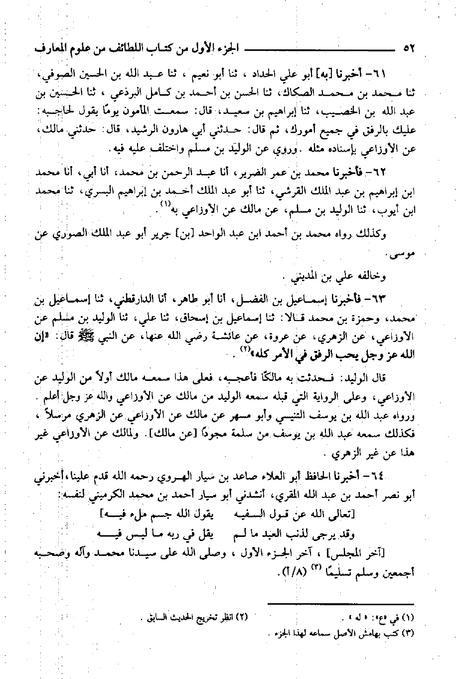 59- أخبرنا أبو علي الحداد رحمه الله غير مرة، ثنا أبو نعيم الحافظ، (ح) وأخبرنا أبو عدنان محمد بن أحمد وغيره رحمهما الله قالا: نا أبو بكر بن ريذة قالا: ثنا سليمان بن -[51]- أحمد، ثنا حبوش بن رزق الله المصري، ثنا عبد الله بن يوسف، ثنا سلمة بن العيار، عن مالك، (ح) وأخبرنا أبو علي، ثنا أبو بكر محمد بن علي المقري الجوزداني، ثنا أبو بكر محمد بن إبراهيم بن علي، ثنا سعيد بن أحمد بن زكريا القضاعي، ثنا يونس بن عبد الأعلى، ثنا عبد الله بن وهب، أنا مالك، عن الأوزاعي، عن الزهري، (ح) وأخبرنا محمد بن عمر الضرير، أنا عبد الرحمن بن محمد، أنا أبي، أنا إسماعيل بن محمد الصفار، ثنا عباس الترقفي، ثنا حفص بن عمر العدني، عن مالك، عن الأوزاعي، عن الزهري، عن عروة عن عائشة رضي الله عنها قالت: سمعت رسول الله صلى الله عليه وسلم يقول: وفي رواية سليمان قالت: قال رسول الله صلى الله عليه وسلم: (( [إن الله عز وجل] يحب الرفق في الأمر كله)) .