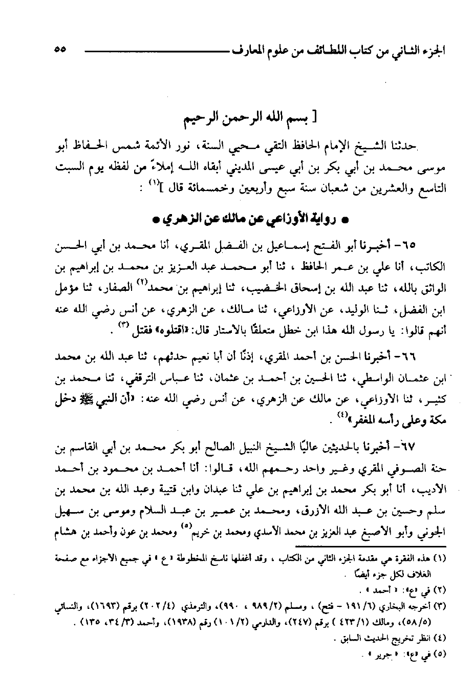 62- فأخبرنا محمد بن عمر الضرير، أنا عبد الرحمن بن محمد، أنا أبي، أنا محمد بن إبراهيم بن عبد الملك القرشي، ثنا أبو عبد الملك أحمد بن إبراهيم البسري، ثنا محمد بن أيوب، ثنا الوليد بن مسلم، عن مالك عن الأوزاعي به.