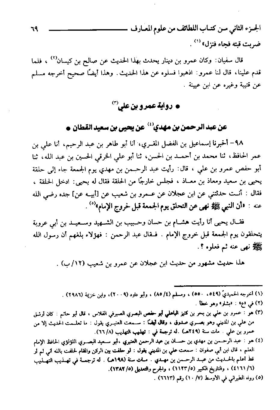 90- أخبرنا الإمام أبو الطيب حبيب بن محمد بن أحمد الطهراني الفقيه، قال: سمعت عبد الله بن محمد بن إبراهيم الفقيه يقول: سمعت أبا الحسن علي بن أحمد يقول: حضرت عند أبي بكر النقاش، وقد جاءه بعض أصحاب الحديث، وقد فاته بعض الجزء فأراد إعادته، فسمعت النقاش، يقول: سمعت إدريس بن عبد الكريم، يقول: سمعت هارون بن عبد الله الجمال، يقول: سمعت يزيد بن هارون، يقول: سمعت سفيان الثوري، يقول: من غاب خاب وأكل نصيبه الأصحاب. ولم يعد له حرفاً.
