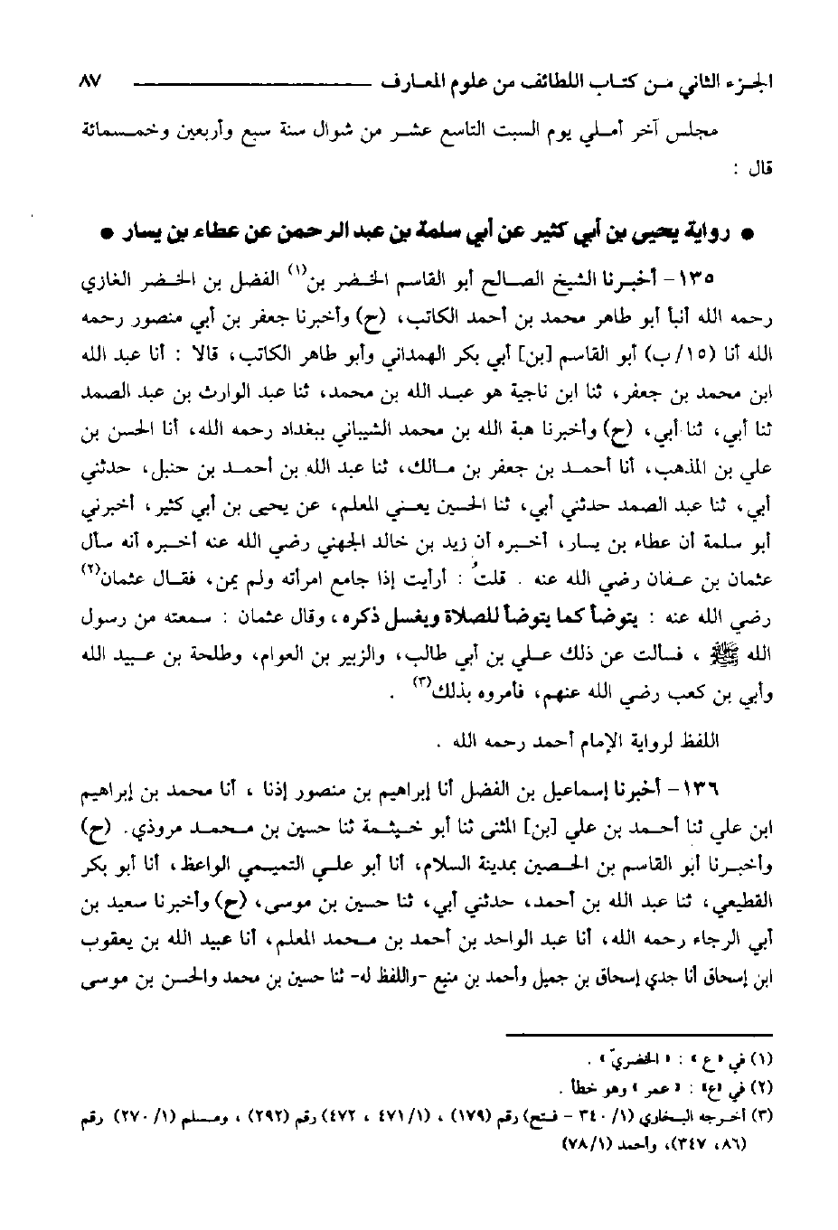 127- أخبرنا بحديثه إسماعيل بن الفضل، أنا محمد بن أحمد الكاتب، أنا علي بن عمر الحافظ، ثنا عبد الله بن أحمد الدمشقي، ثنا أحمد بن عبيد بن ناصح، ثنا علي بن محمد بن أبي سيف ثنا عكرمة بن إبراهيم مثله.