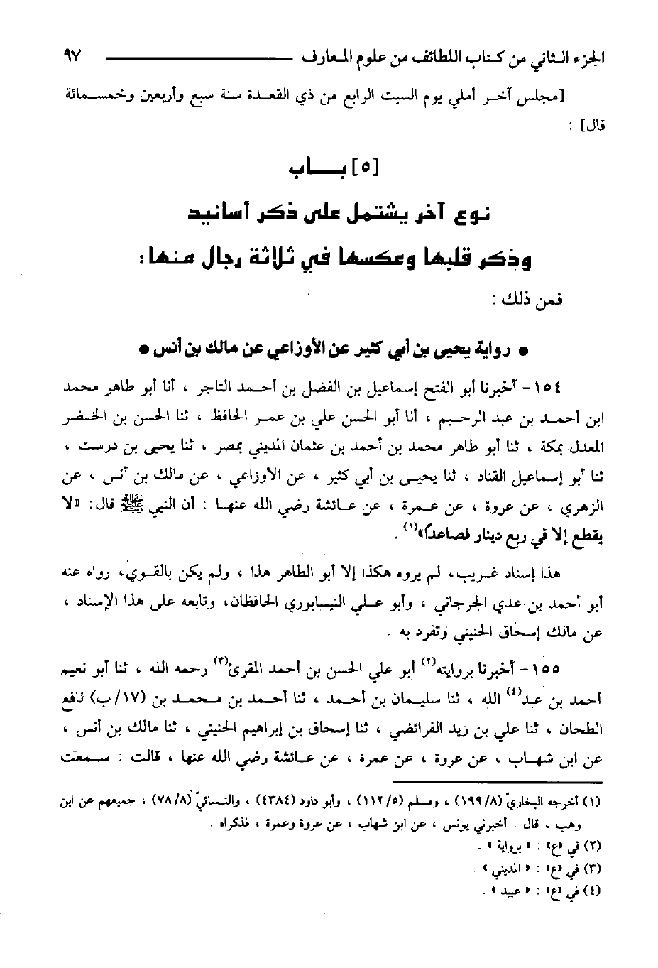 150- وأخبرنا به عالياً من حديث قتيبة أبو عدنان البجيري وغير واحد رحمهم الله قالوا: أنا محمد بن عبد الله الضبي، ثنا سليمان بن أحمد، ثنا عبدان بن محمد المروزي بمكة سنة سبع وثمانين ومائتين. (ح) وقرأته على أبي القاسم بن الحصين في رجوعي إلى بغداد في السفرة الأولى في جامع القصر، أنا أبو طالب بن غيلان، ثنا أبو إسحاق إبراهيم بن محمد بن يحيى المزكي، ثنا محمد بن إسحاق السراج، قالا: ثنا قتيبة بهذا الحديث، زاد محمد بن إسحاق قال قتيبة: عليه سبع علامات، علامة أحمد بن حنبل ويحيى بن معين وأبي خيثمة وأبي بكر بن أبي شيبة والحميدي حتى عد سبعة، ذكر بعضهم مكان الحميدي يحيى الحماني، وقال بعض الحفاظ: الرجلان اللذان أغفلهما: أبو زرعة الرازي، ومسلم بن الحجاج.