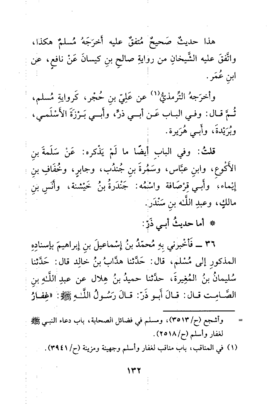 36- فأخبرني به محمد بن إسماعيل بن إبراهيم بإسناده المذكور إلى مسلم، قال: حدثنا هداب بن خالد قال: حدثنا سليمان بن المغيرة، حدثنا حميد بن هلال عن عبد الله بن الصامت قال: قال أبو ذر قال رسول الله صلى الله عليه وسلم : ((غفار