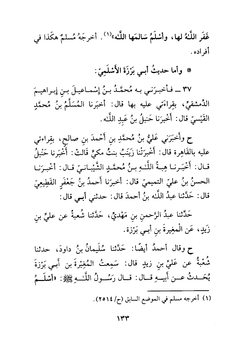 ح وقال أحمد أيضاً: حدثنا سليمان بن داود، حدثنا شعبة عن علي بن زيدٍ قال: سمعت المغيرة بن أبي برزة يحدث عن أبيه قال: قال رسول الله صلى الله عليه وسلم : ((أسلم