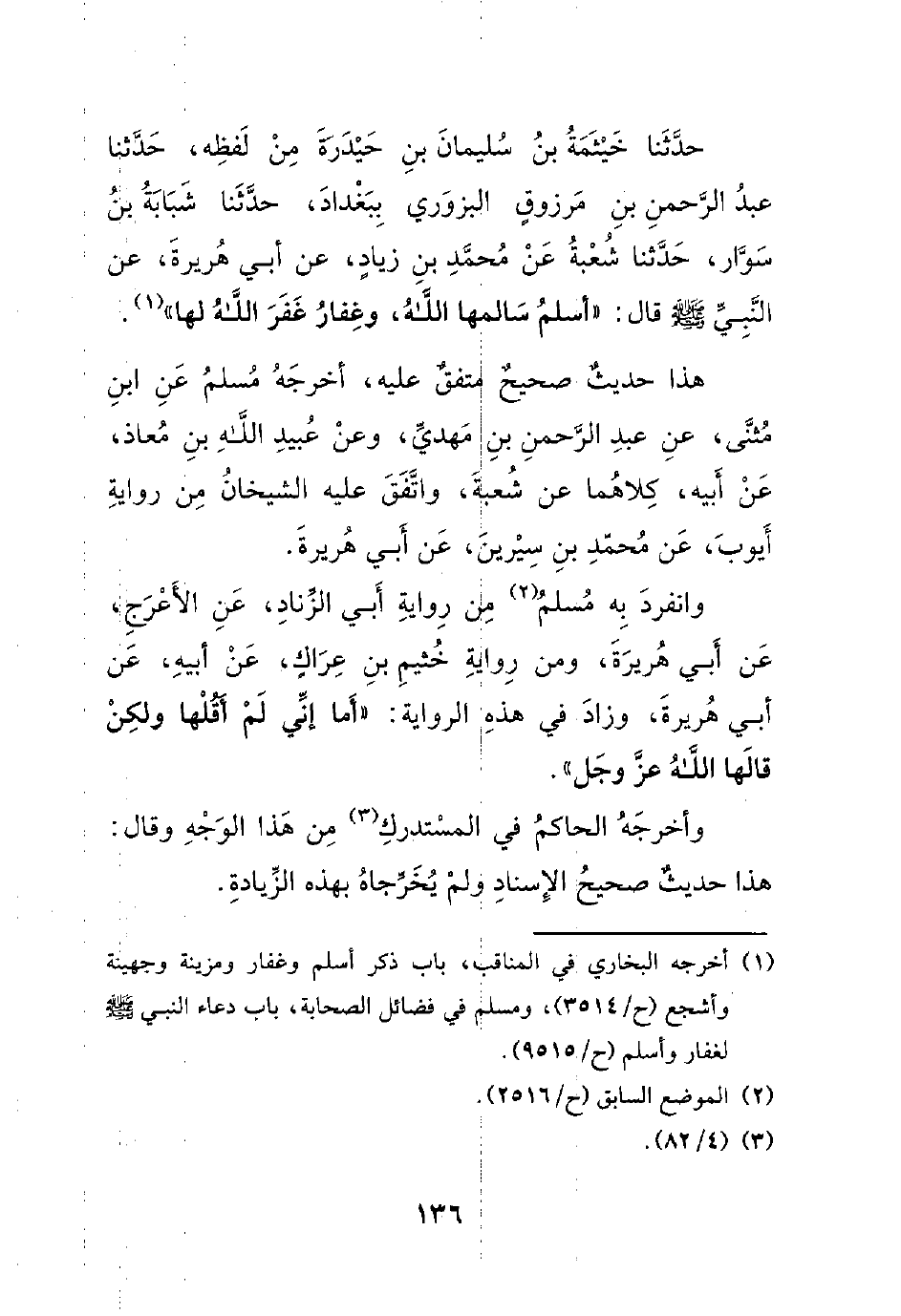 حدثنا خيثمة بن سليمان بن حيدرة من لفظه، حدثنا عبد الرحمن بن مرزوقٍ البزوري ببغداد، حدثنا شبابة بن سوار، حدثنا شعبة عن محمد بن زيادٍ، عن أبي هريرة، عن النبي صلى الله عليه وسلم قال: ((أسلم سالمها الله، وغفار غفر الله لها)).