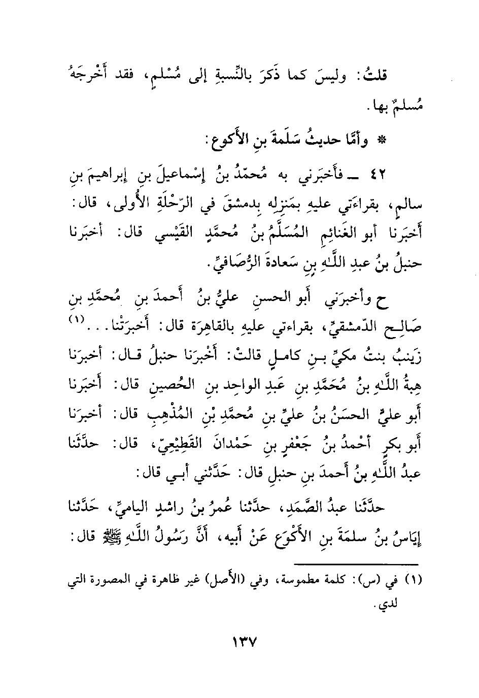 42-فأخبرني به محمد بن إسماعيل بن إبراهيم بن سالمٍ، بقراءتي عليه بمنزله بدمشق في الرحلة الأولى، قال: أخبرنا أبو الغنائم المسلم بن محمدٍ القيسي قال: أخبرنا حنبل بن عبد الله بن سعادة الرصافي.