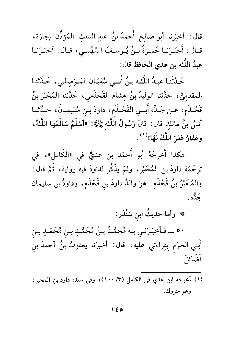 قال: أخبرنا أبو صالح أحمد بن عبد الملك المؤذن إجازة، قال: أخبرنا حمزة بن يوسف السهمي، قال: أخبرنا عبد الله بن عدي الحافظ قال: