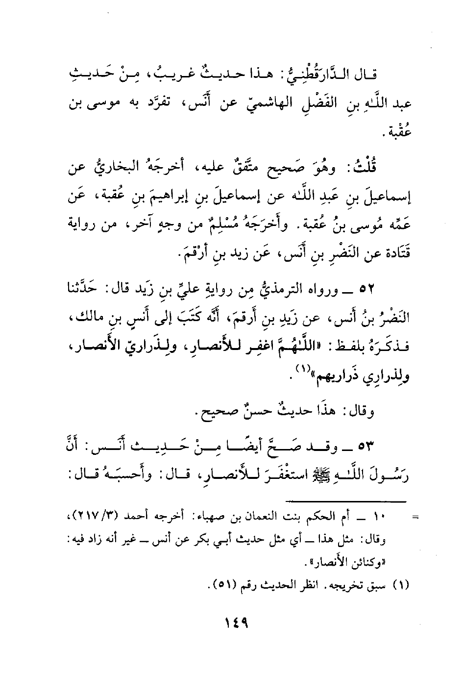 53- وقد صح أيضاً من حديث أنس: أن رسول الله صلى الله عليه وسلم استغفر للأنصار، قال: وأحسبه قال: