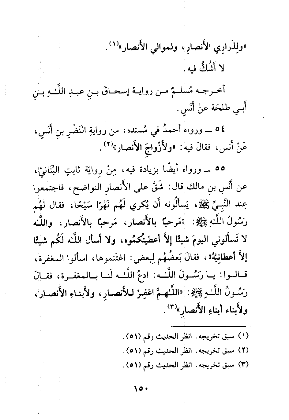 55- ورواه أيضاً بزيادة فيه، من رواية ثابتٍ البناني، عن أنس بن مالك قال: شق على الأنصار النواضح، فاجتمعوا عند النبي صلى الله عليه وسلم ، يسألونه أن يكري لهم نهراً سيحاً، فقال لهم رسول الله صلى الله عليه وسلم : ((مرحباً بالأنصار، مرحباً بالأنصار، والله لا تسألوني اليوم شيئاً إلا أعطيتكموه، ولا أسأل الله لكم شيئاً إلا أعطانيه))، فقال بعضهم لبعض: اغتنموها، اسألوا المغفرة، قالوا: يا رسول الله: ادع الله لنا بالمغفرة، فقال رسول الله صلى الله عليه وسلم : ((اللهم اغفر للأنصار، ولأبناء الأنصار، ولأبناء أبناء الأنصار)).