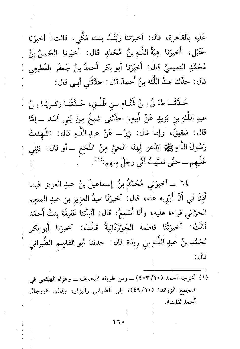 عليه بالقاهرة، قال: أخبرتنا زينب بنت مكي، قالت: أخبرنا حنبل، أخبرنا هبة الله بن محمد قال: أخبرنا الحسن بن محمد التميمي قال: أخبرنا أبو بكر أحمد بن جعفر القطيعي قال: حدثنا عبد الله بن أحمد قال: حدثني أبي قال: