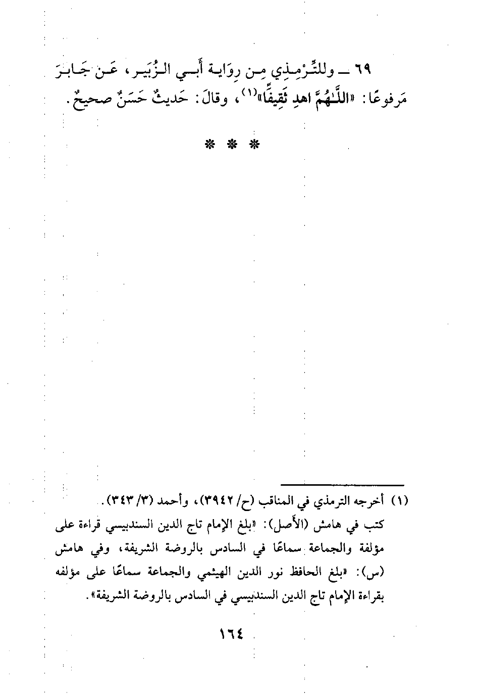 69- وللترمذي من رواية أبي الزبير، عن جابر مرفوعاً: ((اللهم اهد ثقيفاً))، وقال: حديثٌ حسنٌ صحيحٌ.