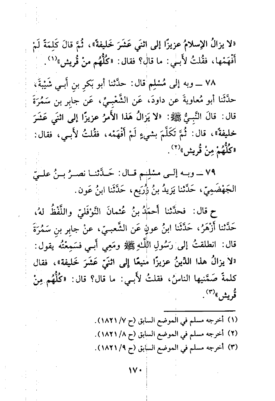 78- وبه إلى مسلم قال: حدثنا أبو بكر بن أبي شيبة، حدثنا أبو معاوية عن داود، عن الشعبي، عن جابر بن سمرة قال: قال النبي صلى الله عليه وسلم : ((لا يزال هذا الأمر عزيزاً إلى اثني عشر خليفةً))، قال: ثم تكلم بشيءٍ لم أفهمه، فقلت لأبي، فقال: ((كلهم من قريش)).