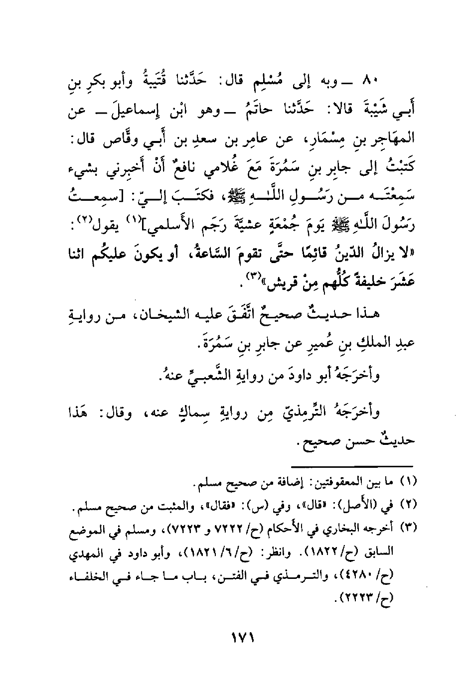 80- وبه إلى مسلم قال: حدثنا قتيبة وأبو بكر بن أبي شيبة قالا: حدثنا حاتم -وهو ابن إسماعيل- عن المهاجر بن مسمار، عن عامر بن سعد بن أبي وقاص قال: كتبت إلى جابر بن سمرة مع غلامي نافعٌ أن أخبرني بشيء سمعته من رسول الله صلى الله عليه وسلم ، فكتب إلي: [سمعت رسول الله صلى الله عليه وسلم يوم جمعةٍ عشية رجم الأسلمي] يقول: ((لا يزال الدين قائماً حتى تقوم الساعة، أو يكون عليكم اثنا عشر خليفةً كلهم من قريش)).