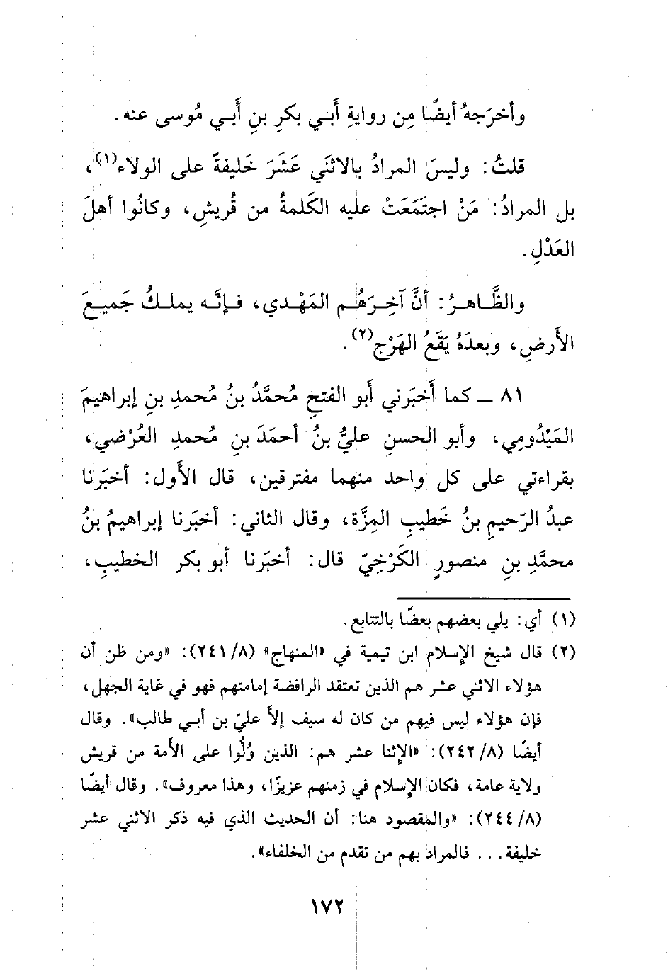 قلت: وليس المراد بالاثني عشر خليفةً على الولاء، بل المراد: من اجتمعت عليه الكلمة من قريش، وكانوا أهل العدل.