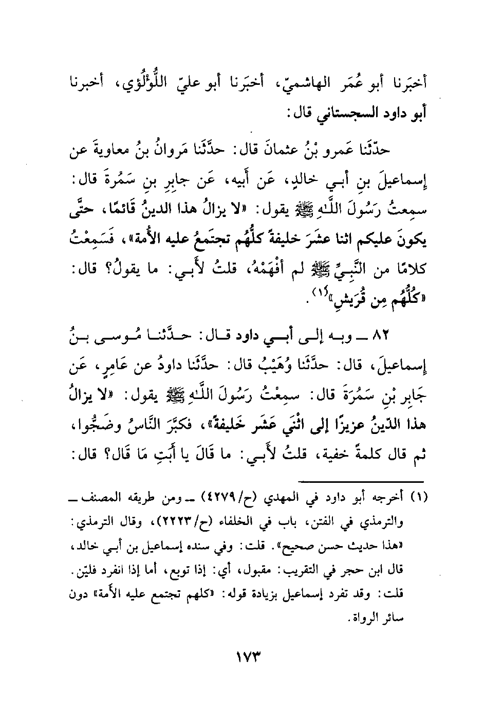 82- وبه إلى أبي داود قال: حدثنا موسى بن إسماعيل، قال: حدثنا وهيب قال: حدثنا داود عن عامر، عن جابر بن سمرة قال: سمعت رسول الله صلى الله عليه وسلم يقول: ((لا يزال هذا الدين عزيزاً إلى اثني عشر خليفةً))، فكبر الناس وضجوا، ثم قال كلمةً خفية، قلت لأبي: ما قال يا أبت ما قال؟ قال: