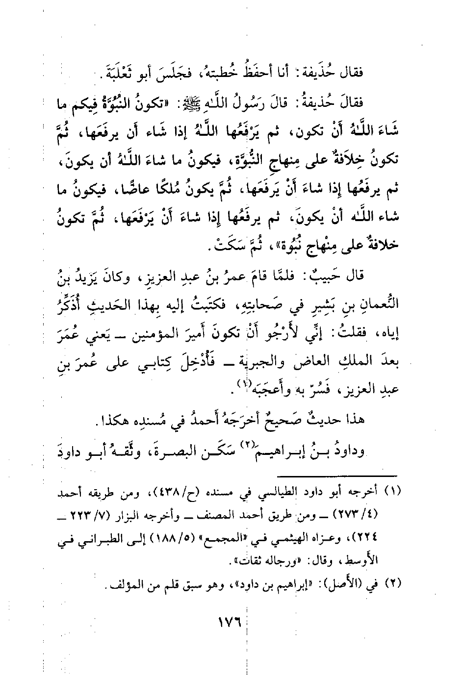 فقال حذيفة: قال رسول الله صلى الله عليه وسلم : ((تكون النبوة فيكم ما شاء الله أن تكون، ثم يرفعها الله إذا شاء أن يرفعها، ثم تكون خلافةٌ على منهاج النبوة، فيكون ما شاء الله أن يكون، ثم يرفعها إذا شاء أن يرفعها، ثم يكون ملكاً عاضاً، فيكون ما شاء الله أن يكون، ثم يرفعها إذا شاء أن يرفعها، ثم تكون خلافةٌ على منهاج نبوة))، ثم سكت.