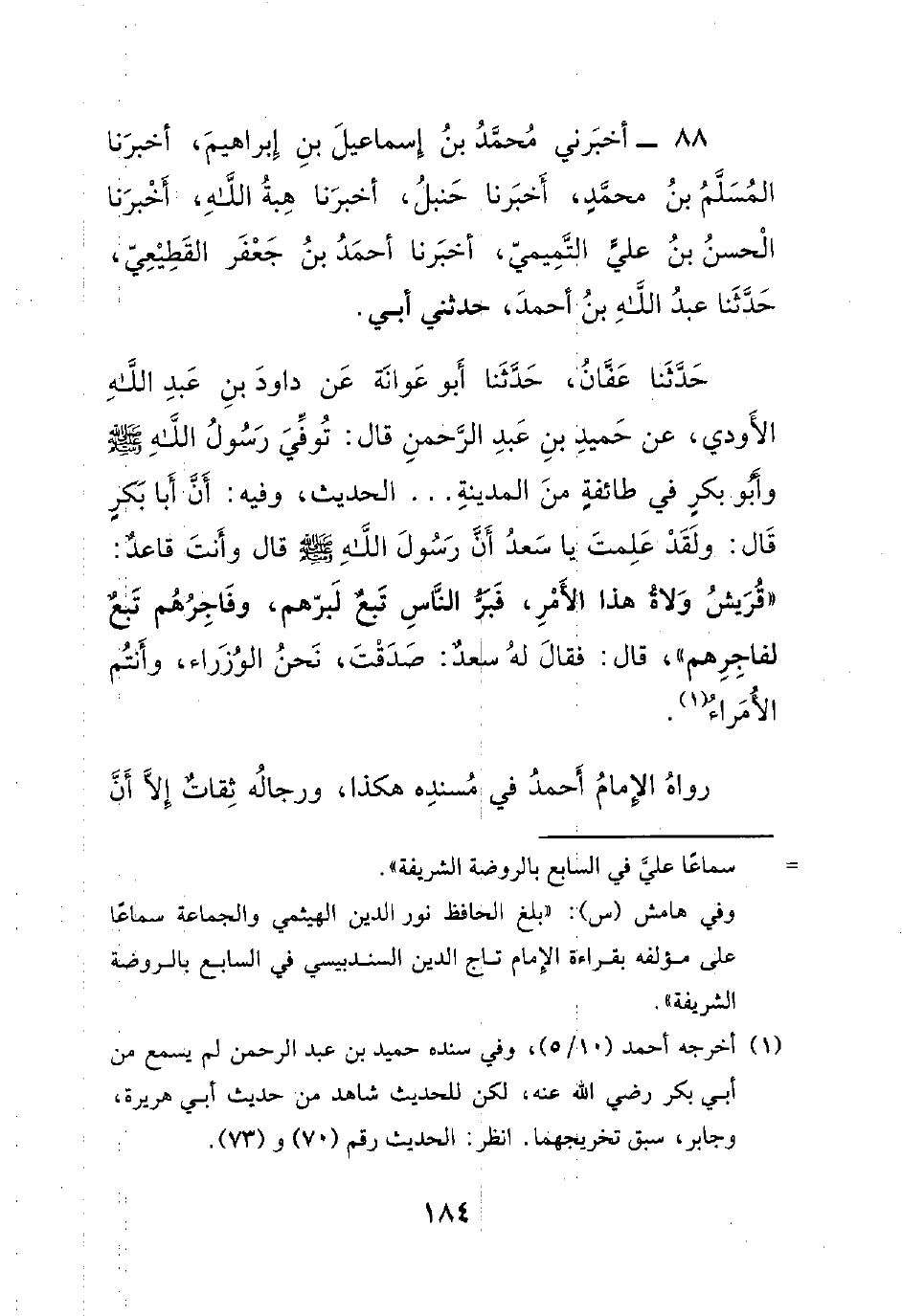 حدثنا عفان، حدثنا أبو عوانة عن داود بن عبد الله الأودي، عن حميد بن عبد الرحمن قال: توفي رسول الله صلى الله عليه وسلم وأبو بكرٍ في طائفةٍ من المدينة.. .. الحديث، وفيه: أن أبا بكرٍ قال: ولقد علمت يا سعد أن رسول الله صلى الله عليه وسلم قال وأنت قاعدٌ: ((قريش ولاة هذا الأمر، فبر الناس تبعٌ لبرهم، وفاجرهم تبعٌ لفاجرهم))، قال: فقال له سعدٌ: صدقت، نحن الوزراء، وأنتم الأمراء.