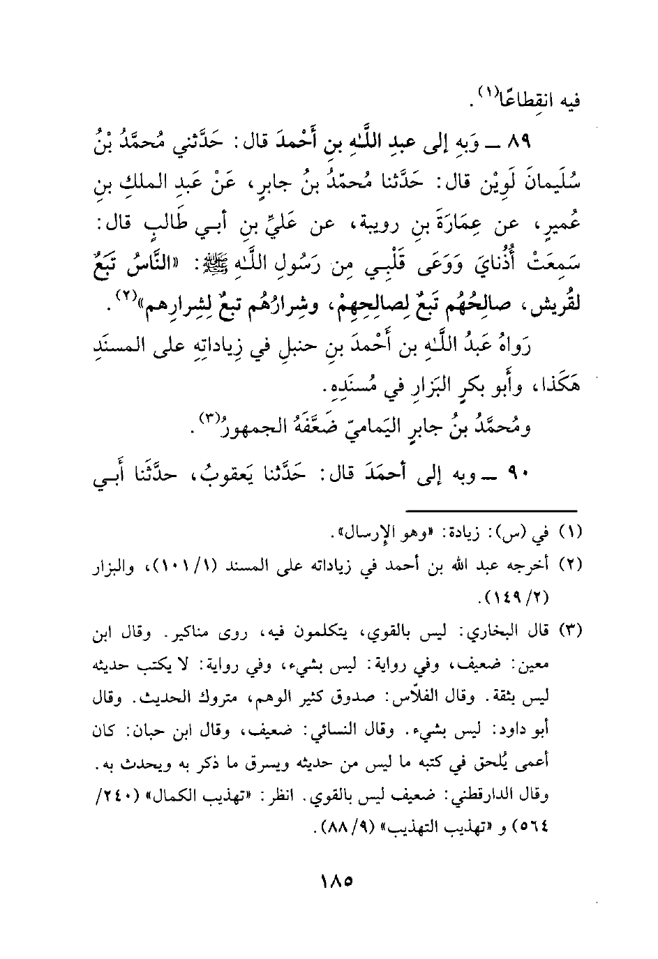 89- وبه إلى عبد الله بن أحمد قال: حدثني محمد بن سليمان لوين قال: حدثنا محمد بن جابرٍ، عن عبد الملك بن عمير، عن عمارة بن رويبة، عن علي بن أبي طالبٍ قال: سمعت أذناي ووعى قلبي من رسول الله صلى الله عليه وسلم : ((الناس تبعٌ لقريش، صالحهم تبع لصالحهم، وشرارهم تبعٌ لشرارهم)).