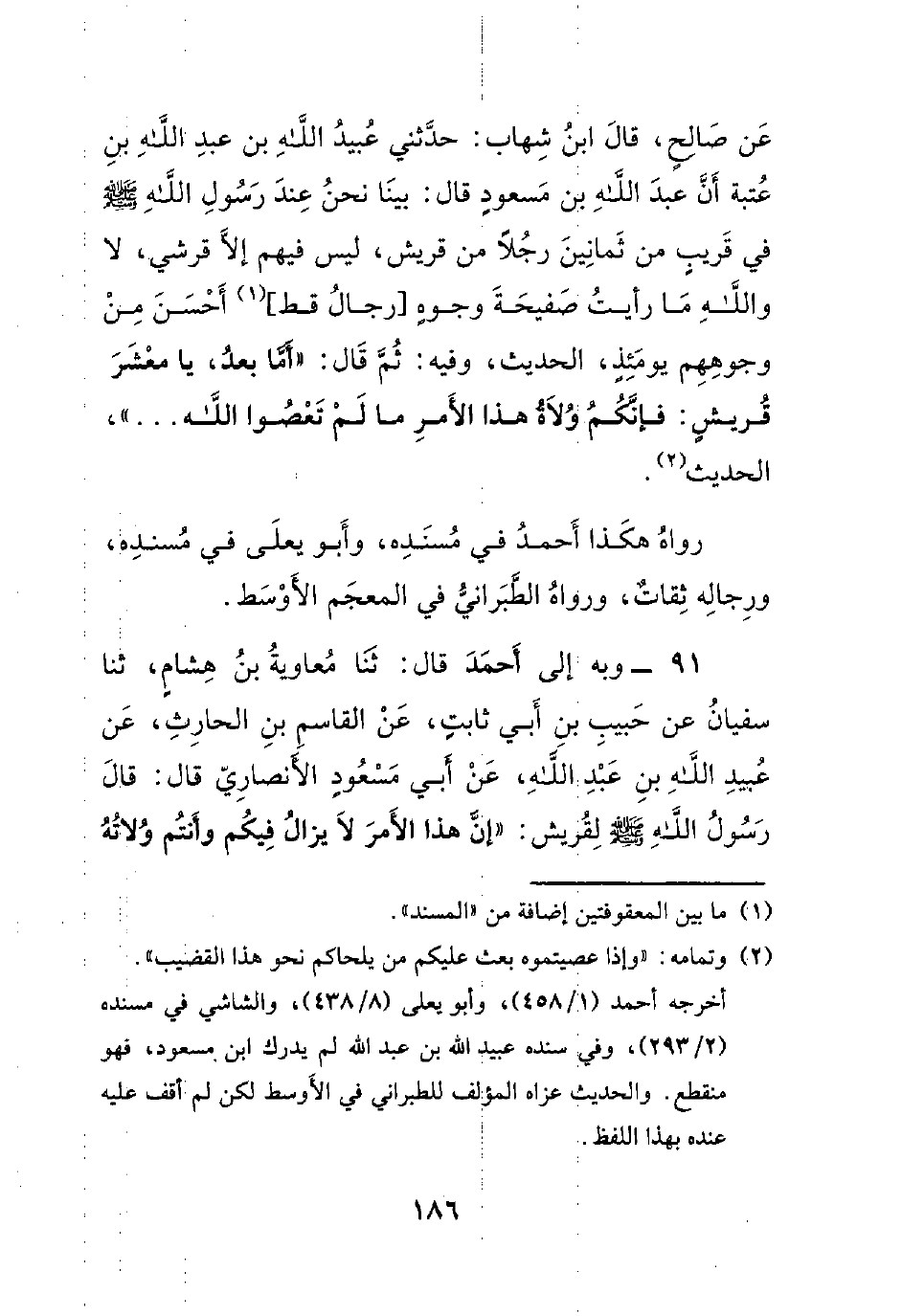 عن صالحٍ، قال ابن شهاب: حدثني عبيد الله بن عبد الله بن عتبة أن عبد الله بن مسعودٍ قال: بينا نحن عند رسول الله صلى الله عليه وسلم في قريبٍ من ثمانين رجلاً من قريش، ليس فيهم إلا قرشي، لا والله ما رأيت صفيحة وجوهٍ [رجال قط] أحسن من وجوههم يومئذٍ، الحديث، وفيه: ثم قال: ((أما بعد، يا معشر قريشٍ: فإنكم ولاة هذا الأمر ما لم تعصوا الله.. .. ))، الحديث.
