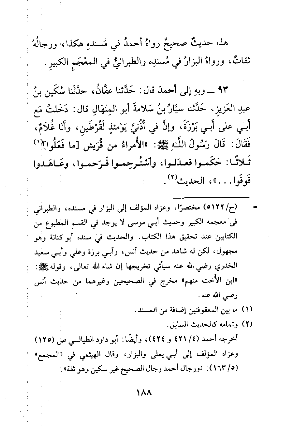 93- وبه إلى أحمد قال: حدثنا عفان، حدثنا سكين بن عبد العزيز، حدثنا سيار بن سلامة أبو المنهال قال: دخلت مع أبي على أبي برزة، وإن في أذني يومئذٍ لقرطين، وأنا غلامٌ، فقال: قال رسول الله صلى الله عليه وسلم : ((الأمراء من قريش [ما فعلوا] ثلاثاً: حكموا فعدلوا، واسترحموا فرحموا، وعاهدوا فوفوا.. .. ))، الحديث.