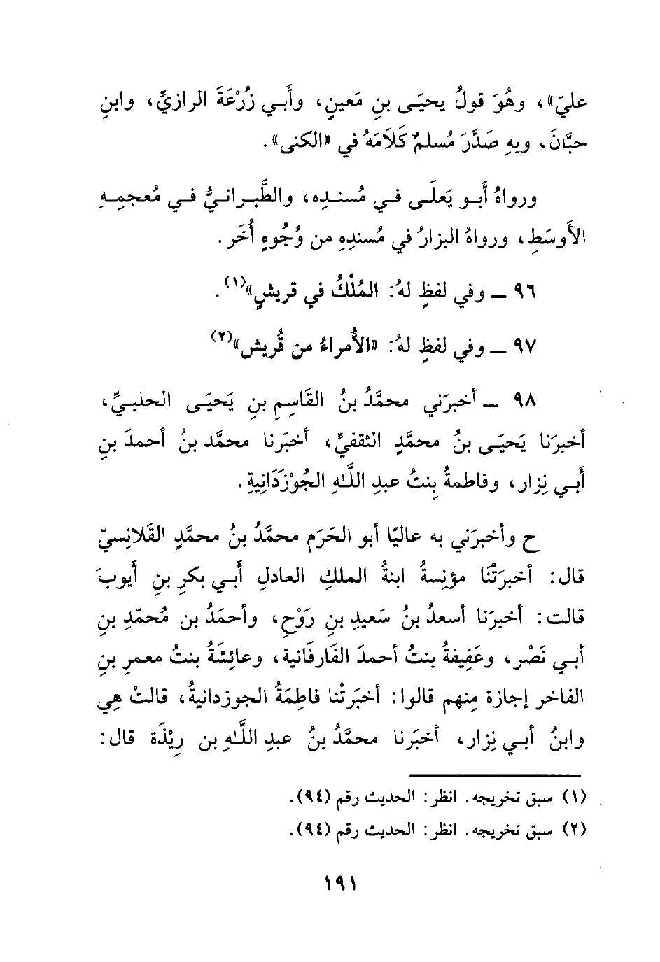 96- وفي لفظٍ له: ((الملك في قريشٍ)).