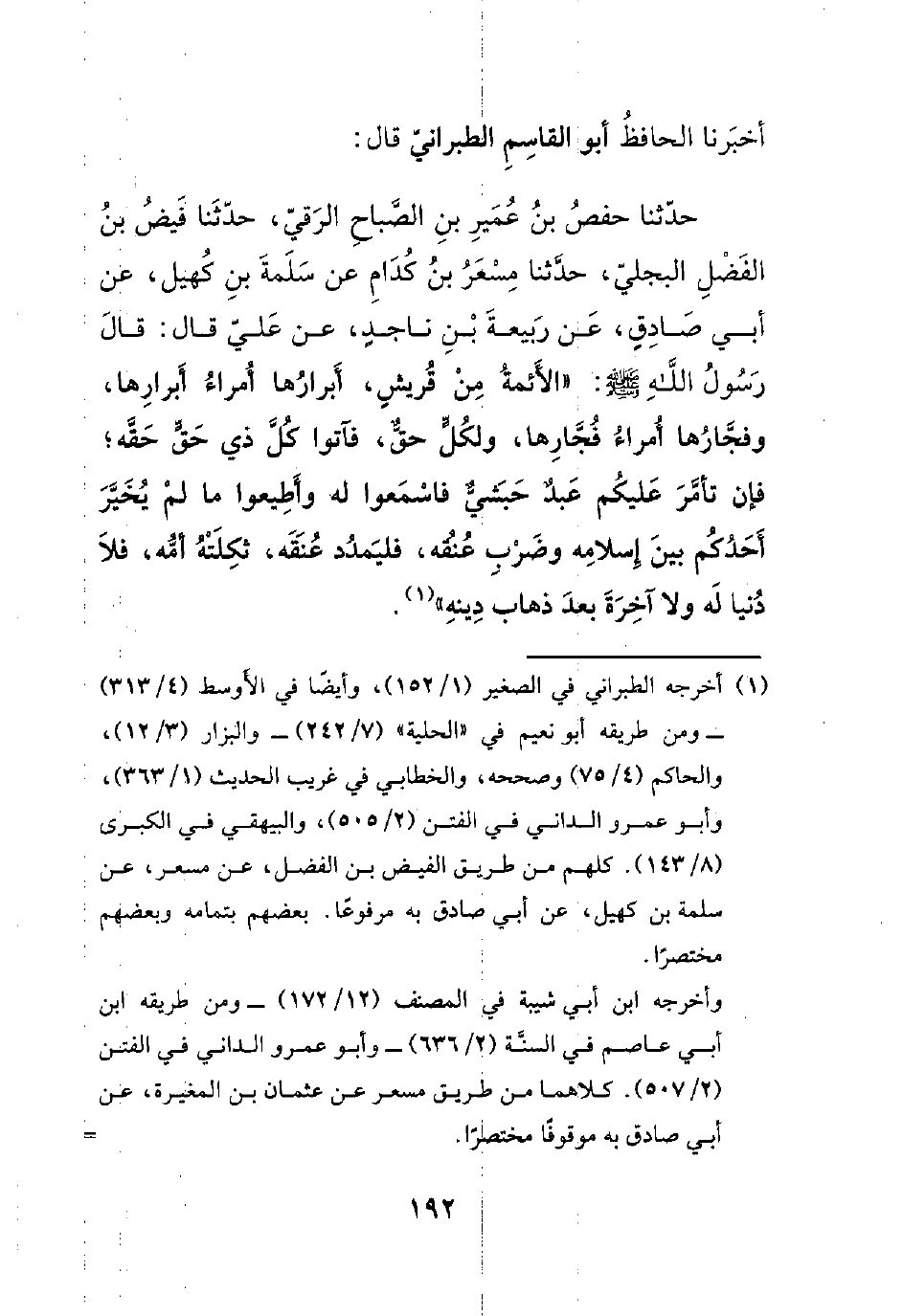 حدثنا حفص بن عمير بن الصباح الرقي، حدثنا فيض بن الفضل البجلي، حدثنا مسعر بن كدام عن سلمة بن كهيل، عن أبي صادقٍ، عن ربيعة بن ناجدٍ، عن علي قال: قال رسول الله صلى الله عليه وسلم : ((الأئمة من قريشٍ، أبرارها أمراء أبرارها، وفجارها أمراء فجارها، ولكلٍ حقٌ، فآتوا كل ذي حقٍ حقه؛ فإن تأمر عليكم عبدٌ حبشيٌ فاسمعوا له وأطيعوا ما لم يخير أحدكم بين إسلامه وضرب عنقه، فليمدد عنقه، ثكلته أمه، فلا دنيا له ولا آخرة بعد ذهاب دينه)).