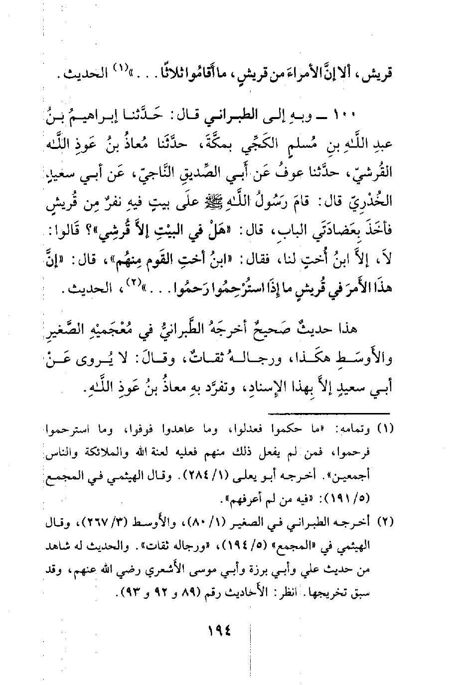 100- وبه إلى الطبراني قال: حدثنا إبراهيم بن عبد الله بن مسلمٍ الكجي بمكة، حدثنا معاذ بن عوذ الله القرشي، حدثنا عوف عن أبي الصديق الناجي، عن أبي سعيدٍ الخدري قال: قام رسول الله صلى الله عليه وسلم على بيتٍ فيه نفرٌ من قريشٍ فأخذ بعضادتي الباب، قال: ((هل في البيت إلا قرشي؟)) قالوا: لا، إلا ابن أختٍ لنا، فقال: ((ابن أخت القوم منهم))، قال: ((إن هذا الأمر في قريشٍ ما إذا استرحموا رحموا.. .. ))، الحديث.