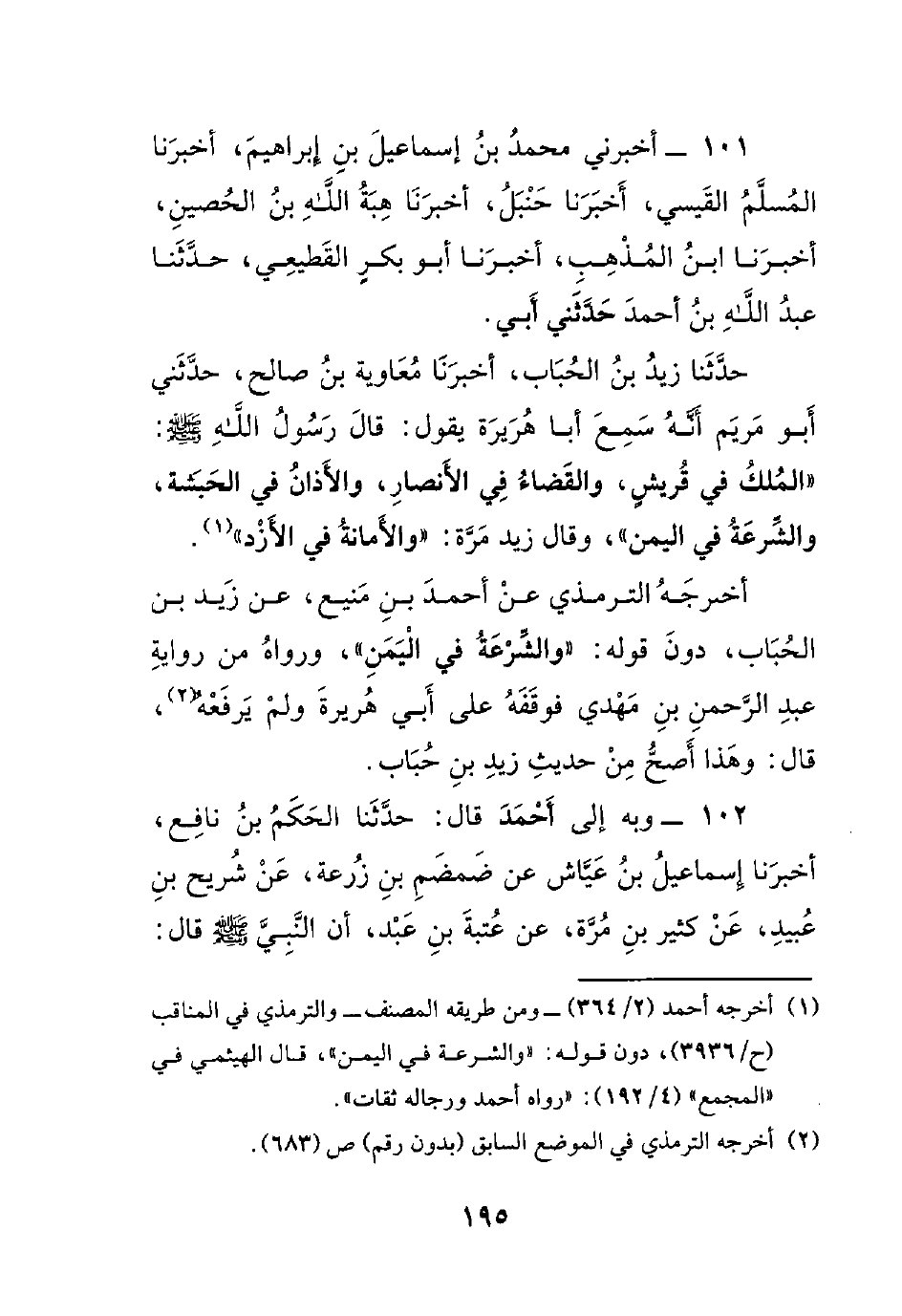 101- أخبرني محمد بن إسماعيل بن إبراهيم، أخبرنا المسلم القيسي، أخبرنا حنبل، أخبرنا هبة الله بن الحصين، أخبرنا ابن المذهب، أخبرنا أبو بكرٍ القطيعي، حدثنا عبد الله بن أحمد حدثني أبي.