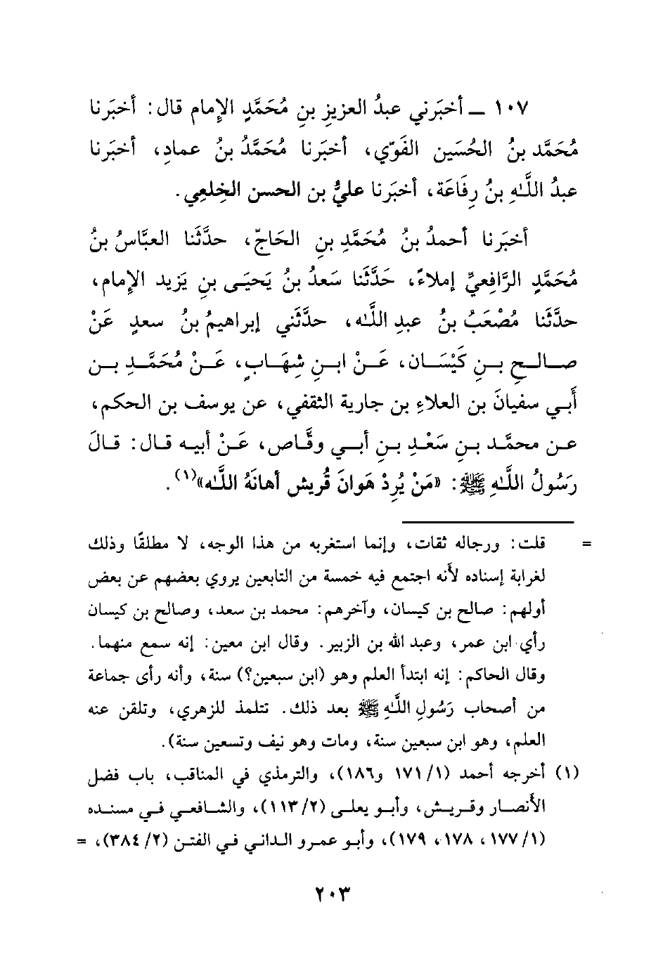 أخبرنا أحمد بن محمد بن الحاج، حدثنا العباس بن محمدٍ الرافعي إملاءً، حدثنا سعد بن يحيى بن يزيد الإمام، حدثنا مصعب بن عبد الله، حدثني إبراهيم بن سعدٍ عن صالحٍ بن كيسان، عن ابن شهابٍ، عن محمد بن أبي سفيان بن العلاء بن جارية الثقفي، عن يوسف بن الحكم، عن محمد بن سعد بن أبي وقاص، عن أبيه قال: قال رسول الله صلى الله عليه وسلم : ((من يرد هوان قريش أهانه الله)).