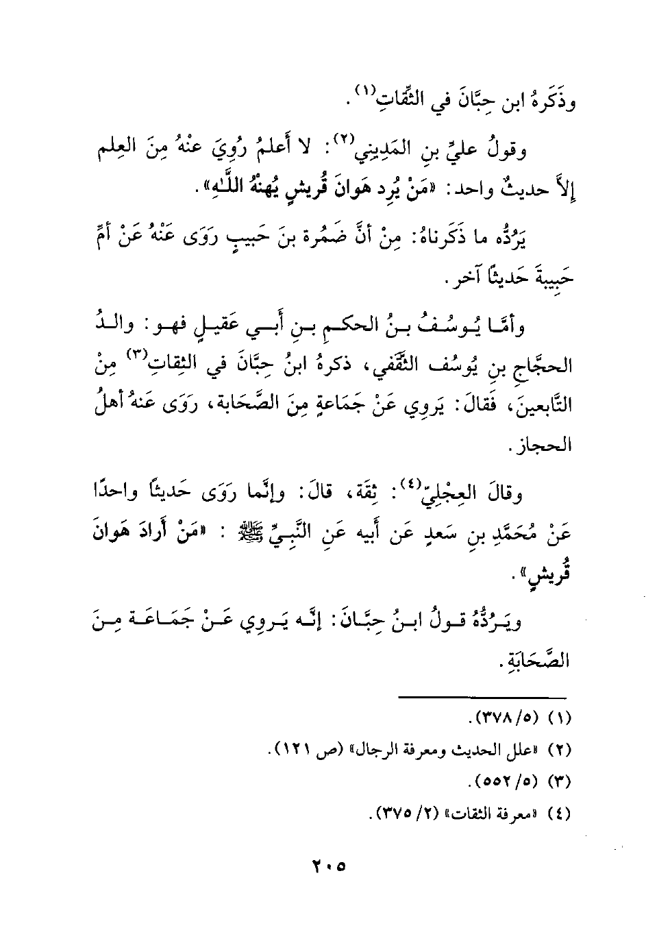 وقول علي بن المديني: لا أعلم روي عنه من العلم إلا حديثٌ واحد: ((من يرد هوان قريشٍ يهنه الله)).