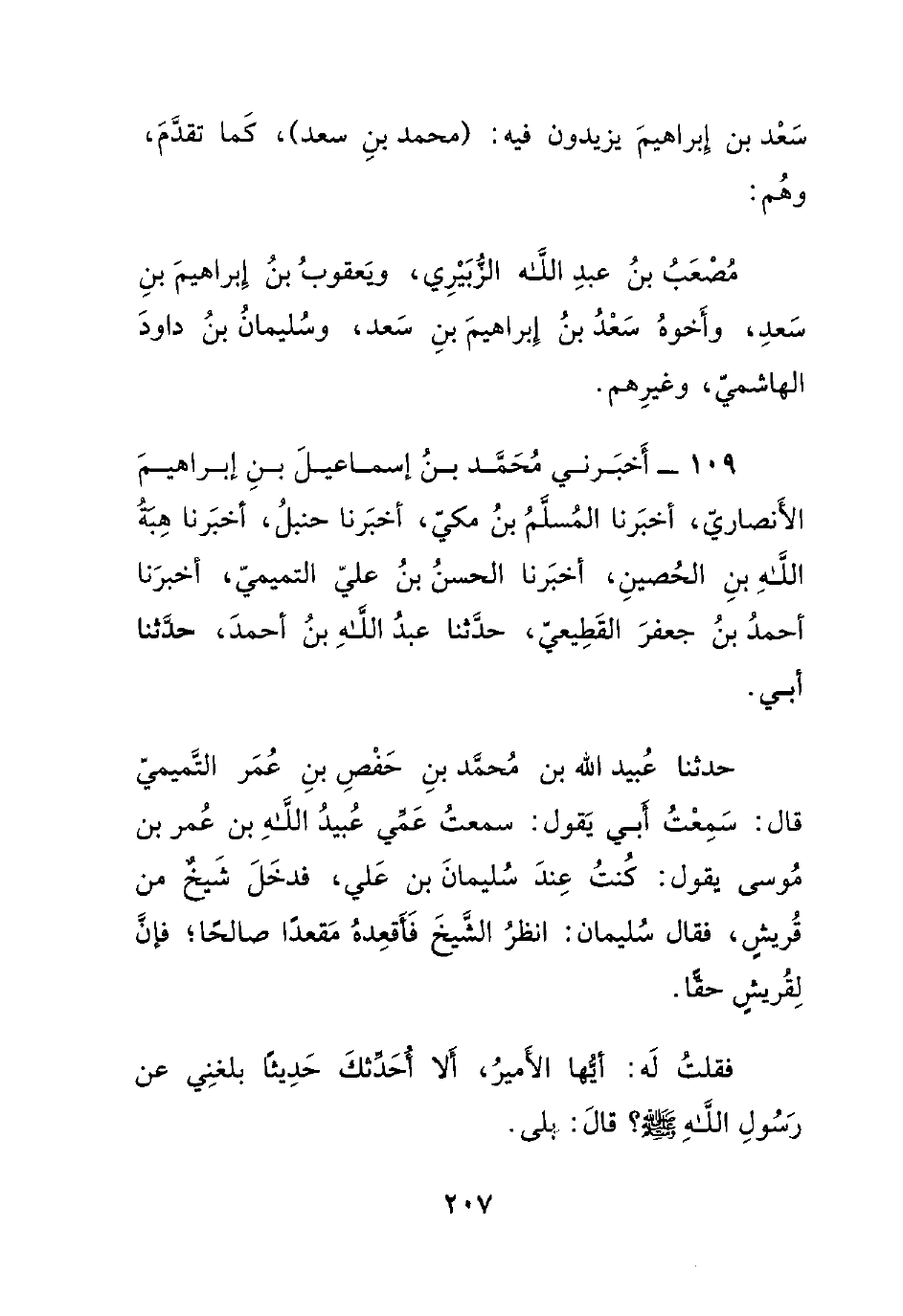 109- أخبرني محمد بن إسماعيل بن إبراهيم الأنصاري، أخبرنا المسلم بن مكي، أخبرنا حنبل، أخبرنا هبة الله بن الحصين، أخبرنا الحسن بن علي التميمي، أخبرنا أحمد بن جعفر القطيعي، حدثنا عبد الله بن أحمد، حدثنا أبي.