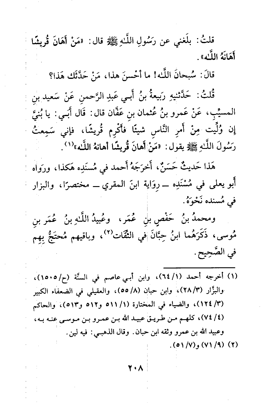 قلت: حدثنيه ربيعة بن أبي عبد الرحمن عن سعيد بن المسيب، عن عمرو بن عثمان بن عفان قال: قال أبي: يا بني إن وليت من أمر الناس شيئاً فأكرم قريشاً، فإني سمعت رسول الله صلى الله عليه وسلم يقول: ((من أهان قريشاً أهانه الله)).