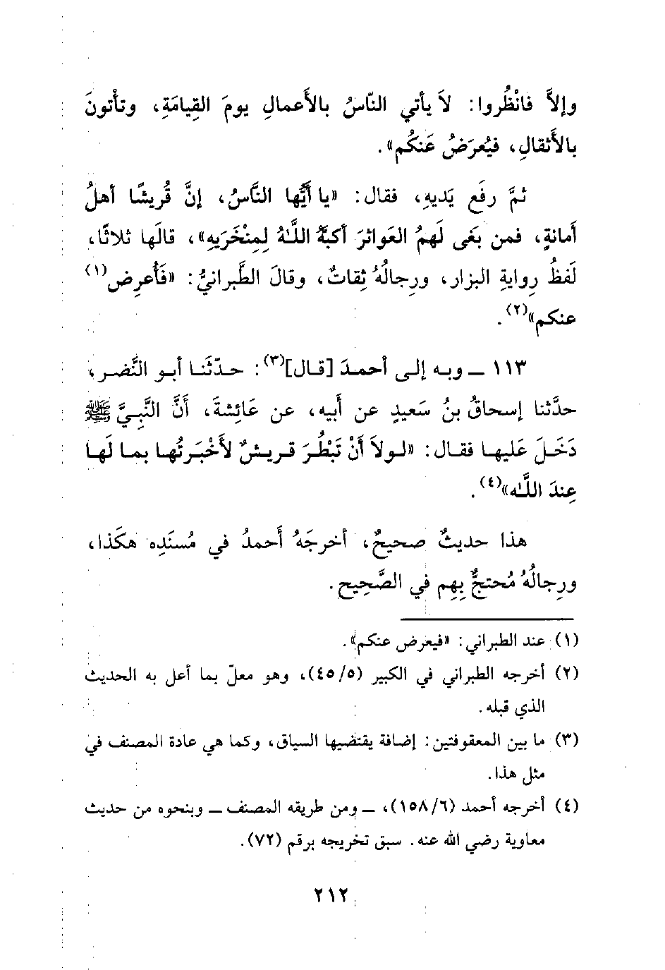 113- وبه إلى أحمد [قال]: حدثنا أبو النضر، حدثنا إسحاق بن سعيدٍ عن أبيه، عن عائشة، أن النبي صلى الله عليه وسلم دخل عليها فقال: ((لولا أن تبطر قريشٌ لأخبرتها بما لها عند الله)).