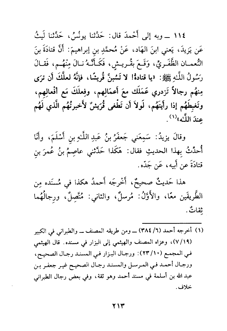 114- وبه إلى أحمد قال: حدثنا يونس، حدثنا ليث عن يزيد، يعني ابن الهاد، عن محمد بن إبراهيم: أن قتادة بن النعمان الظفري، وقع بقريشٍ، فكأنه نال منهم، فقال رسول الله صلى الله عليه وسلم : ((يا قتادة! لا تسبن قريشاً، فإنه لعلك أن ترى منهم رجالاً تزدري عملك مع أعمالهم، وفعلك مع أفعالهم، وتغبطهم إذا رأيتهم، لولا أن تطغى قريشٌ لأخبرتهم الذي لهم عند الله)).