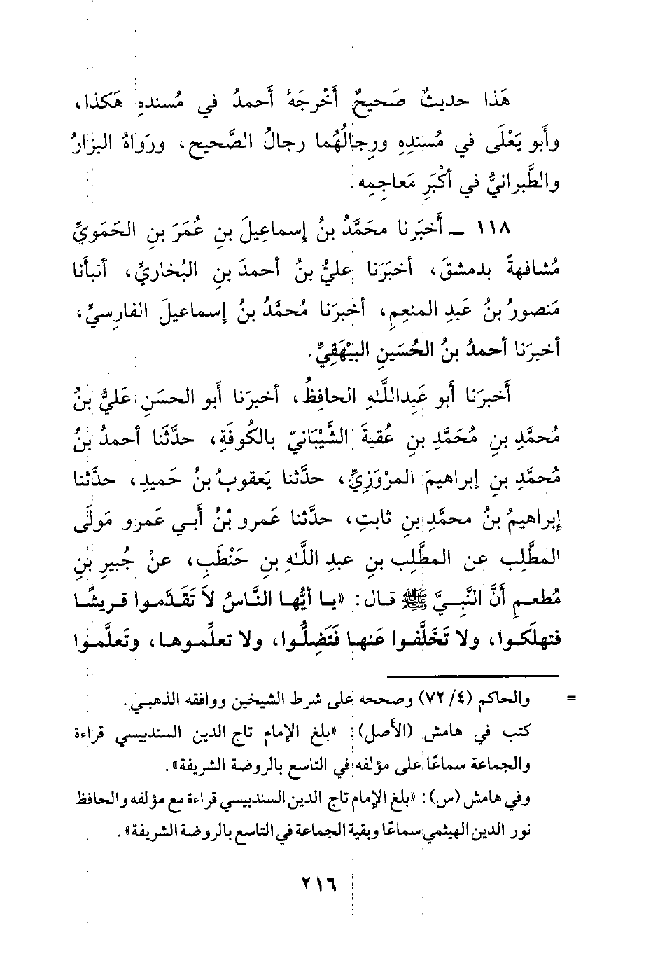 118- أخبرنا محمد بن إسماعيل بن عمر بن الحموي مشافهةً بدمشق، أخبرنا علي بن أحمد بن البخاري، أنبأنا منصور بن عبد المنعم، أخبرنا محمد بن إسماعيل الفارسي، أخبرنا أحمد بن الحسين البيهقي.