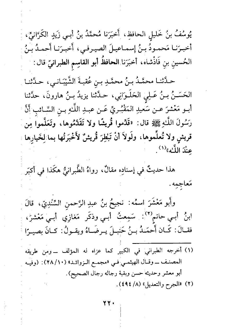 حدثنا محمد بن محمد بن عقبة الشيباني، حدثنا الحسن بن علي الحلواني، حدثنا يزيد بن هارون، حدثنا أبو معشر عن سعيد المقبري عن عبد الله بن السائب أن رسول الله صلى الله عليه وسلم قال: ((قدموا قريشاً ولا تقدموها، وتعلموا من قريشٍ ولا تعلموها، ولولا أن تبطر قريشٌ لأخبرتها بما لخيارها عند الله)).