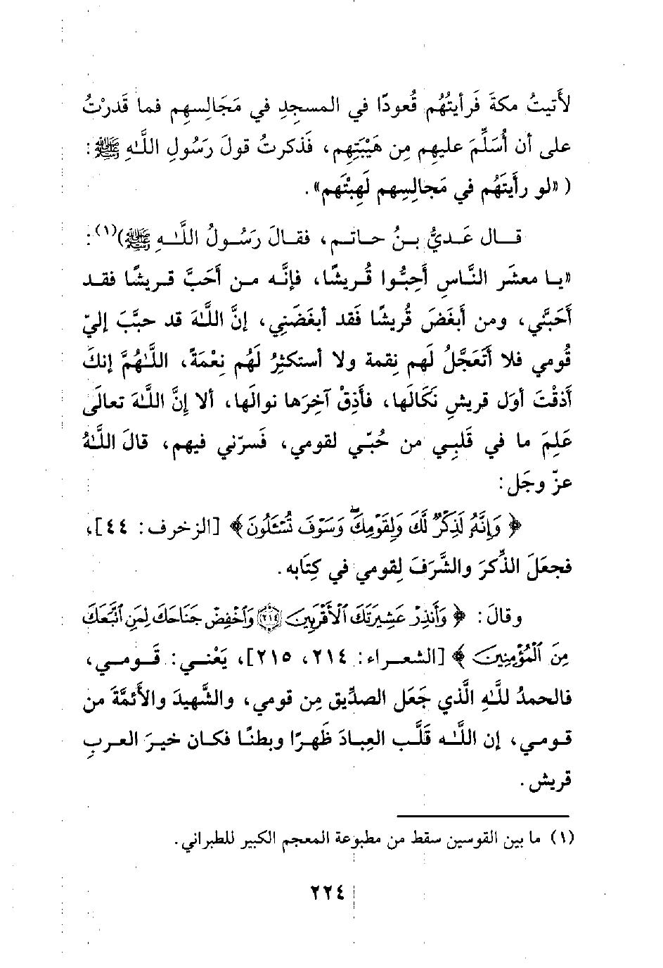 ((يا معشر الناس أحبوا قريشاً، فإنه من أحب قريشاً فقد أحبني، ومن أبغض قريشاً فقد أبغضني، إن الله قد حبب إلي قومي فلا أتعجل لهم نقمة ولا أستكثر لهم نعمةً، اللهم إنك أذقت أول قريش نكالها، فأذق آخرها نوالها، ألا إن الله تعالى علم ما في قلبي من حبي لقومي، فسرني فيهم، قال الله عز وجل: