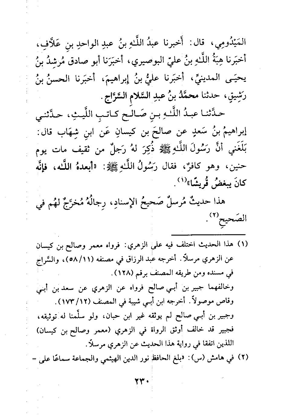حدثنا عبد الله بن صالح كاتب الليث، حدثني إبراهيم بن سعدٍ عن صالح بن كيسان عن ابن شهاب قال: بلغني أن رسول الله صلى الله عليه وسلم ذكر له رجلٌ من ثقيف مات يوم حنين، وهو كافرٌ، فقال رسول الله صلى الله عليه وسلم : ((أبعده الله، فإنه كان يبغض قريشاً)).
