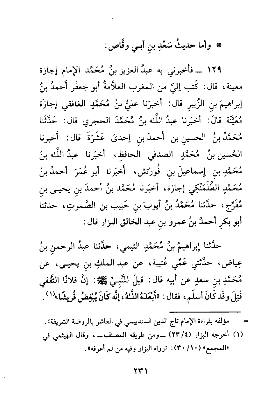 129- فأخبرني به عبد العزيز بن محمد الإمام إجازة معينة، قال: كتب إلي من المغرب العلامة أبو جعفر أحمد بن إبراهيم بن الزبير قال: أخبرنا علي بن محمدٍ الغافقي إجازة معينة قال: أخبرنا عبد الله بن محمد الحجري قال: حدثنا محمد بن الحسين بن أحمد بن إحدى عشرة قال: أخبرنا الحسين بن محمدٍ الصدفي الحافظ، أخبرنا عبد الله بن محمد بن إسماعيل بن فورتش، أخبرنا أبو عمر أحمد بن محمدٍ الطلمنكي إجازة، أخبرنا محمد بن أحمد بن يحيى بن مفرج، حدثنا محمد بن أيوب بن حبيب بن الصموت، حدثنا أبو بكر أحمد بن عمرو بن عبد الخالق البزار قال: