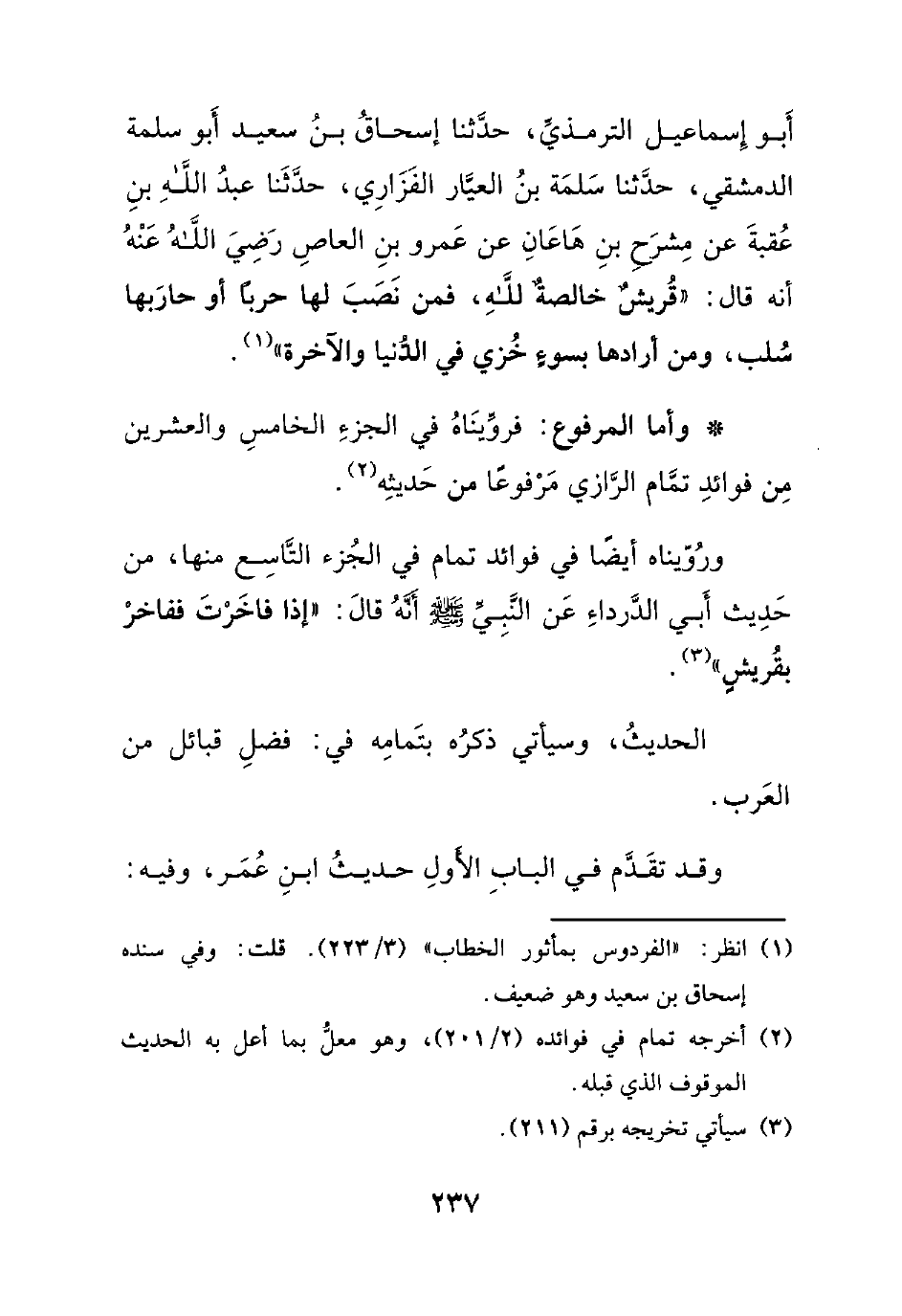 أبو إسماعيل الترمذي، حدثنا إسحاق بن سعيد أبو سلمة الدمشقي، حدثنا سلمة بن العيار الفزاري، حدثنا عبد الله بن عقبة عن مشرح بن هاعان عن عمرو بن العاص رضي الله عنه أنه قال: ((قريشٌ خالصةٌ لله، فمن نصب لها حرباً أو حاربها سلب، ومن أرادها بسوءٍ خزي في الدنيا والآخرة)).
