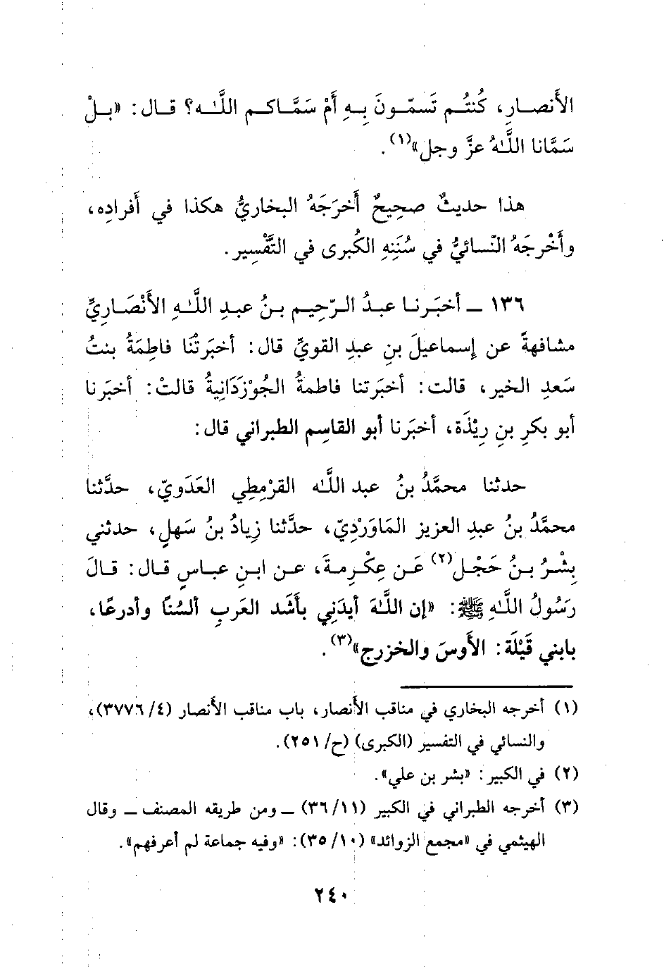حدثنا محمد بن عبد الله القرمطي العدوي، حدثنا محمد بن عبد العزيز الماوردي، حدثنا زياد بن سهلٍ، حدثني بشر بن حجل عن عكرمة، عن ابن عباس قال: قال رسول الله صلى الله عليه وسلم : ((إن الله أيدني بأشد العرب ألسناً وأدرعاً، بابني قيلة: الأوس والخزرج)).