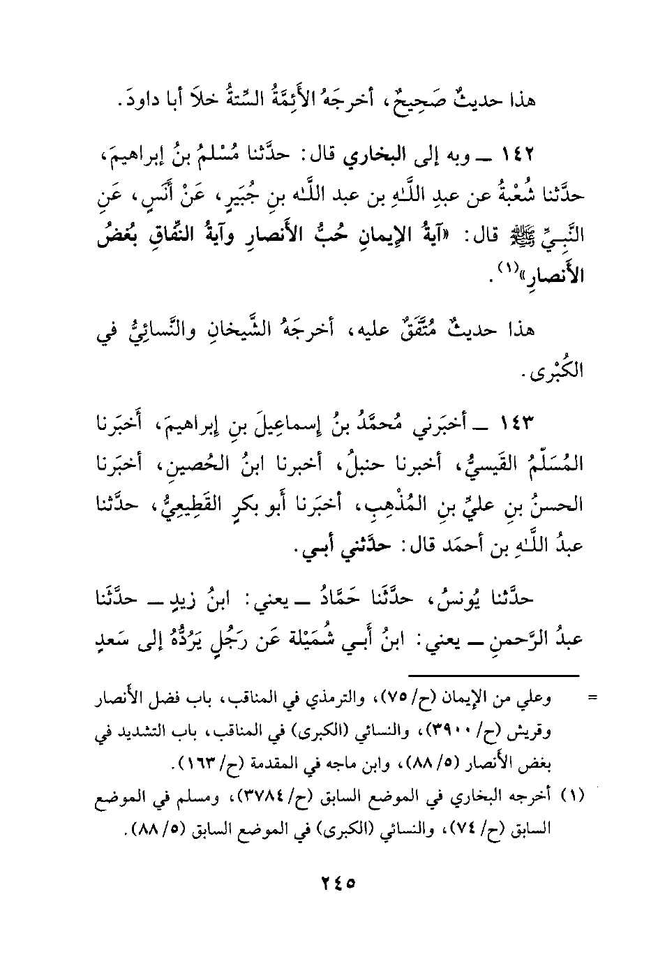 142- وبه إلى البخاري قال: حدثنا مسلم بن إبراهيم، حدثنا شعبة عن عبد الله بن عبد الله بن جبيرٍ، عن أنس، عن النبي صلى الله عليه وسلم قال: ((آية الإيمان حب الأنصار وآية النفاق بغض الأنصار)).