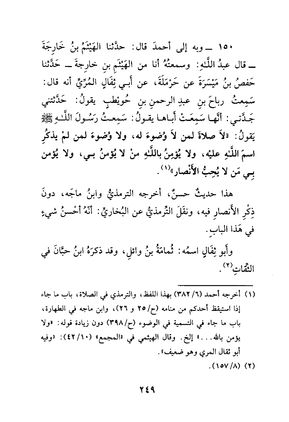 150- وبه إلى أحمد قال: حدثنا الهيثم بن خارجة -قال عبد الله: وسمعته أنا من الهيثم بن خارجة- حدثنا حفص بن ميسرة عن حرملة، عن أبي ثفال المري أنه قال: سمعت رباح بن عبد الرحمن بن حويطب يقول: حدثتني جدتي: أنها سمعت أباها يقول: سمعت رسول الله صلى الله عليه وسلم يقول: ((لا صلاة لمن لا وضوء له، ولا وضوء لمن لم يذكر اسم الله عليه، ولا يؤمن بالله من لا يؤمن بي، ولا يؤمن بي من لا يحب الأنصار)).
