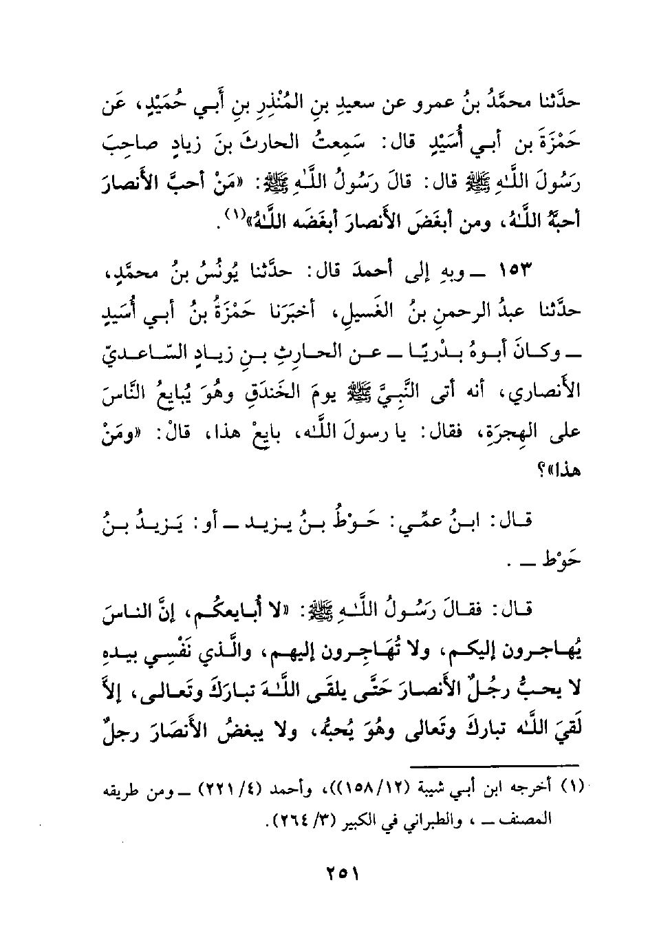 153- وبه إلى أحمد قال: حدثنا يونس بن محمدٍ، حدثنا عبد الرحمن بن الغسيل، أخبرنا حمزة بن أبي أسيدٍ -وكان أبوه بدرياً- عن الحارث بن زياد الساعدي الأنصاري، أنه أتى النبي صلى الله عليه وسلم يوم الخندق وهو يبايع الناس على الهجرة، فقال: يا رسول الله، بايع هذا، قال: ((ومن هذا))؟
